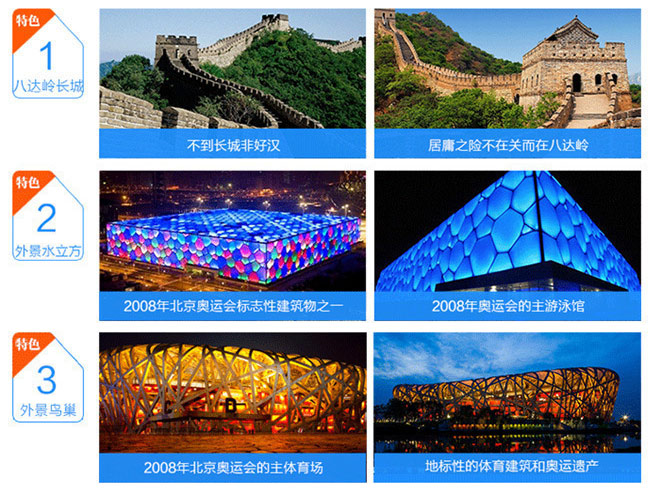 • 八達(dá)嶺長(zhǎng)城、定陵、鳥巢、水立方