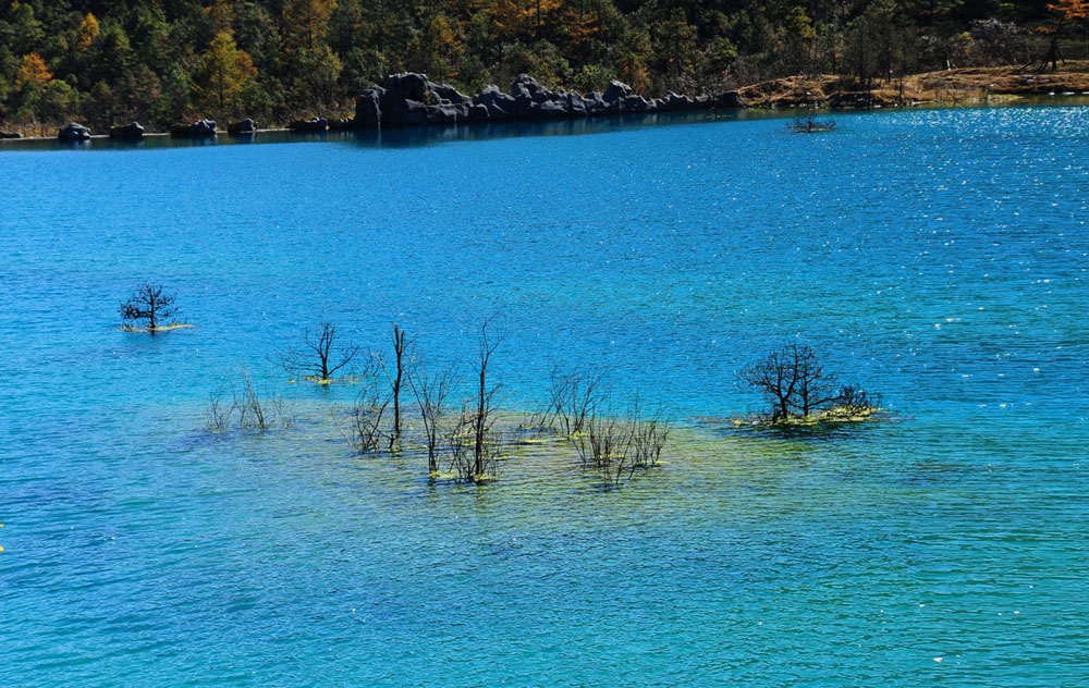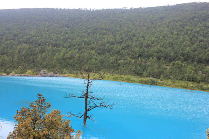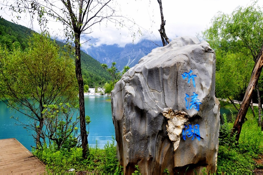 藍月湖:藏于雪山之中被綠樹環(huán)抱,也染上了一層亦仙亦幻的感覺。在這世外桃源般的壞境下,用相機隨便一拍就是明信片。取個雪山背景,大片就出來了,windows的桌面是真實存在。