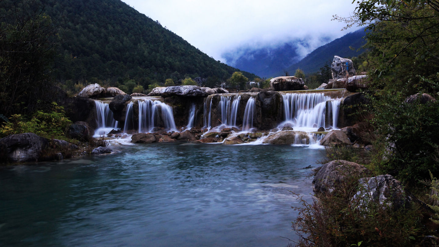 穿過跨越藍月谷的公路大橋,首先來到連接雪山融水與藍月谷的上湖:白水臺,這是碳酸鈣溶解于山水中而形成的自然奇觀。含碳酸氫鈣的山水慢慢下流,碳酸鹽逐漸沉淀,日積月累形成臺幔。