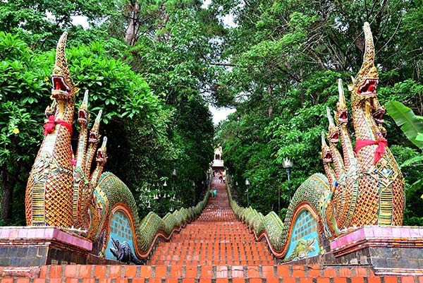 泰國寺廟有“千佛之國”的稱譽,在清邁的雙龍寺,因金光閃耀,顯得相當突出,它位于海拔三千多英尺上的素帖山上,由山上往下看正可俯視清邁,,是著名的佛教避暑勝地,該寺是一座純正的泰式寺廟,相傳在公元一三五五年至一三八五年間,是由白象選址、皇室建造,充滿傳奇色彩的廟宇。傳說當時有位錫蘭高僧攜帶了幾顆佛舍利到泰國,高僧為防不法之人搶奪,便將舍利放在一只白象身上,希望藉由白象來選擇一處可建寺供奉舍利的福地,白象四處游走最后則在雙龍寺的現(xiàn)址停留,于是大眾才在此地建了舍利塔,因山路兩旁有兩只金龍守護,便以雙龍寺為名。 一般的泰國寺廟,正門大多建有兩條巨大的龍身綿延環(huán)繞,廟門兩側(cè)由大象取代中國傳統(tǒng)的石獅子。寺中皆以黃金打造的傘蓋、貼滿金箔的神像、神龕以及屋頂來莊嚴佛寺,金光閃耀的程度常令前往禮拜的游客嘆為觀止,據(jù)當?shù)貙в伪硎?,雙龍寺所用的黃金約有兩百四十二點二公斤。