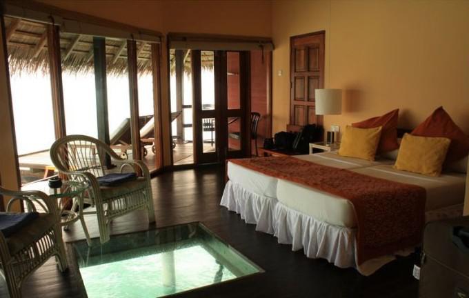 16間舒適迷人的水上屋,那里有七間孟加拉式水上平房被青綠色的水包圍著,除此之外還包括所有的標準設施如電視和piped音樂。設施完備,風景獨特。從自己的水上屋直接步入蔚藍色海洋的懷抱,再不會有更好的方式來享受這美好的事情了。房間內有一大塊玻璃地板,從這里可以看到水下壯觀的珊瑚和海洋生物。到 了晚上,把玻璃地板掀起之后看起來就更迷人了。每間水上屋有獨立的陽臺用于曬日光浴,地面上還有玻璃鑲板,可以觀看水中的魚兒游來游去。