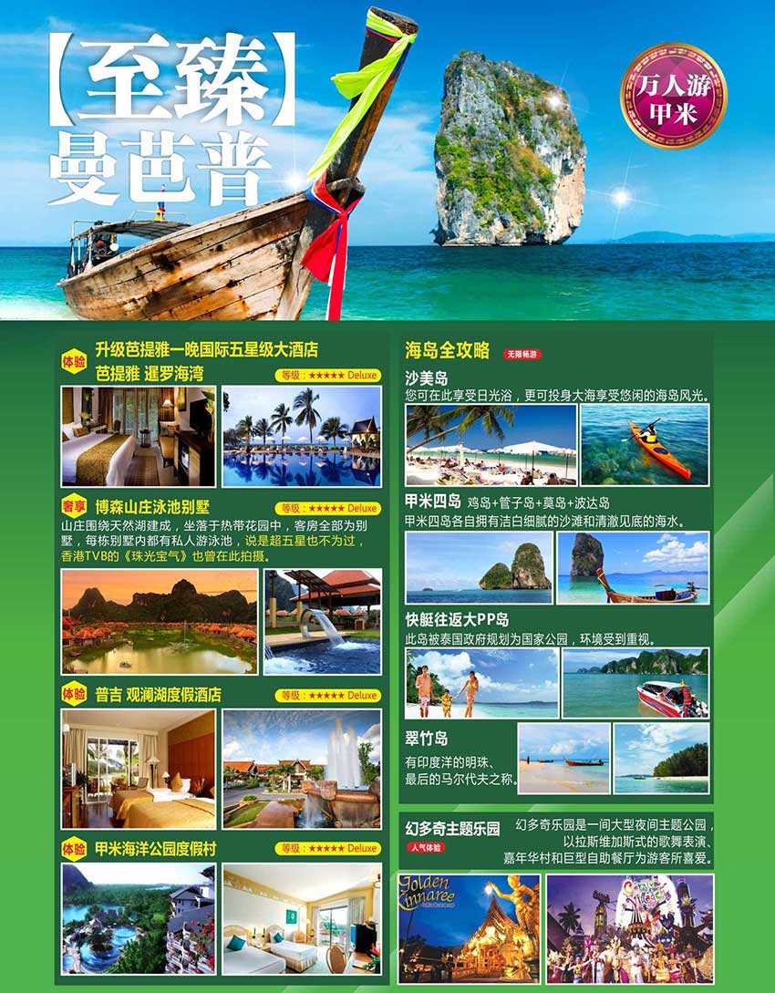 酒店早餐后,我們參觀原石博物館,所有參觀皮具店,后參觀燕窩中心。途中在休息站稍做休整,乘車返回曼谷。后送往曼谷國(guó)際機(jī)場(chǎng)搭乘泰航豪華客機(jī)前往泰南著名海濱度假勝地—【甲米】。泰南海濱度假勝地【甲米】也稱【喀比Krabi】,甲米地處泰國(guó)南部沿海地帶,頻臨安達(dá)曼海,是目前歐美游客前往泰南海濱度假的最愛。甲米的外海部分擁有30多個(gè)小島,境內(nèi)擁有山區(qū)、丘陵和平原等豐富的地貌,并擁有700多條攀巖線路、美不勝收,每年都有成千上萬的攀巖愛好者來到甲米挑戰(zhàn)自我。