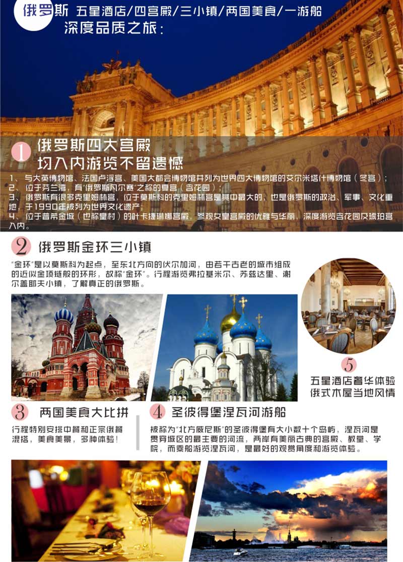 俄羅斯是一個美麗而充滿文化的大國,但必竟是個不斷轉(zhuǎn)形的國家,無論硬件和軟件,都與國內(nèi)發(fā)達(dá)地區(qū)的條件有所差距。但俄羅斯畢竟是一個值得一去的國家,無論如畫的美景還是深厚的文化都會給您留下深刻的印象。希望一切不到位的地方能夠得到您的包容和海涵,謹(jǐn)此向您表達(dá)敬意!